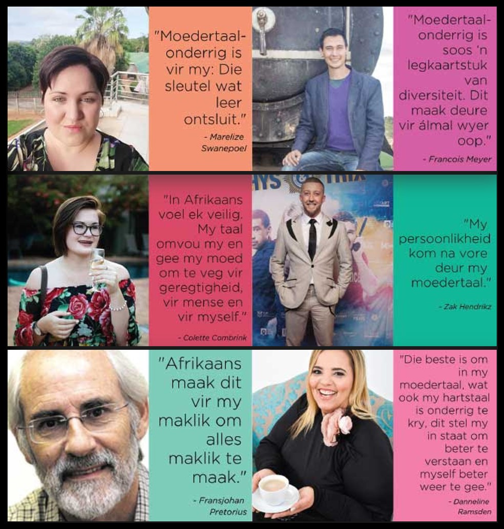 Maar moenie net ons woord daarvoor neem nie. Lees wat sê van ons ambassadeurs vir Afrikaans oor hoe moedertaalonderrig tot hulle sukses bygedra het en nog steeds elke dag bydra.