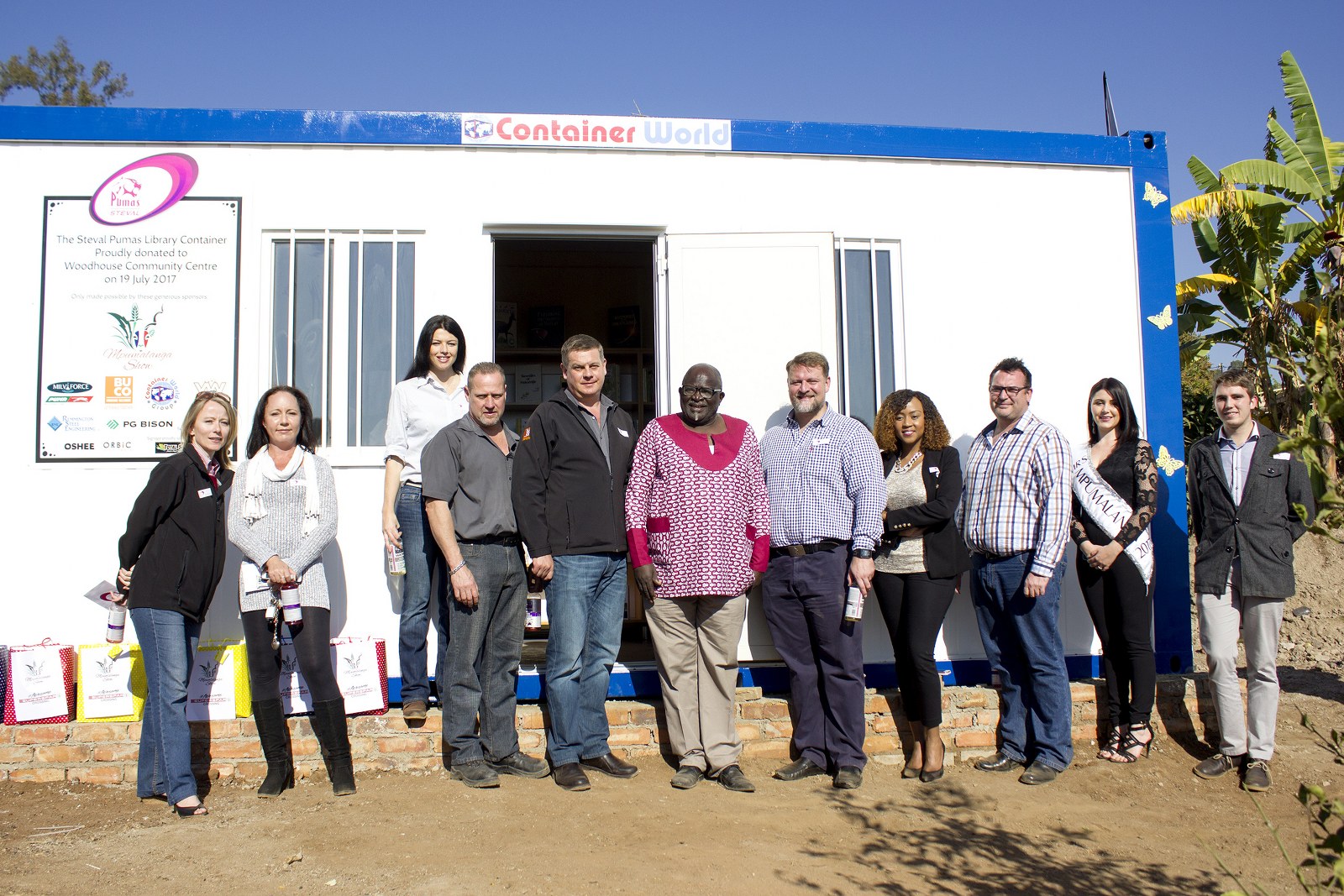 Some of the kids from the Mataffin Community Centre, the generous sponsors and some of the Pumas players standing outside the container library. Photo: Barry Odendaal.