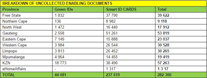 This brings the total of all uncollected identity documents to 282 300 – including all uncollected green ID books and Smart ID Cards. These are kept at Home Affairs offices for a prescribed period of time. We will compile, and distribute, a list of people who must collect their identity documents.