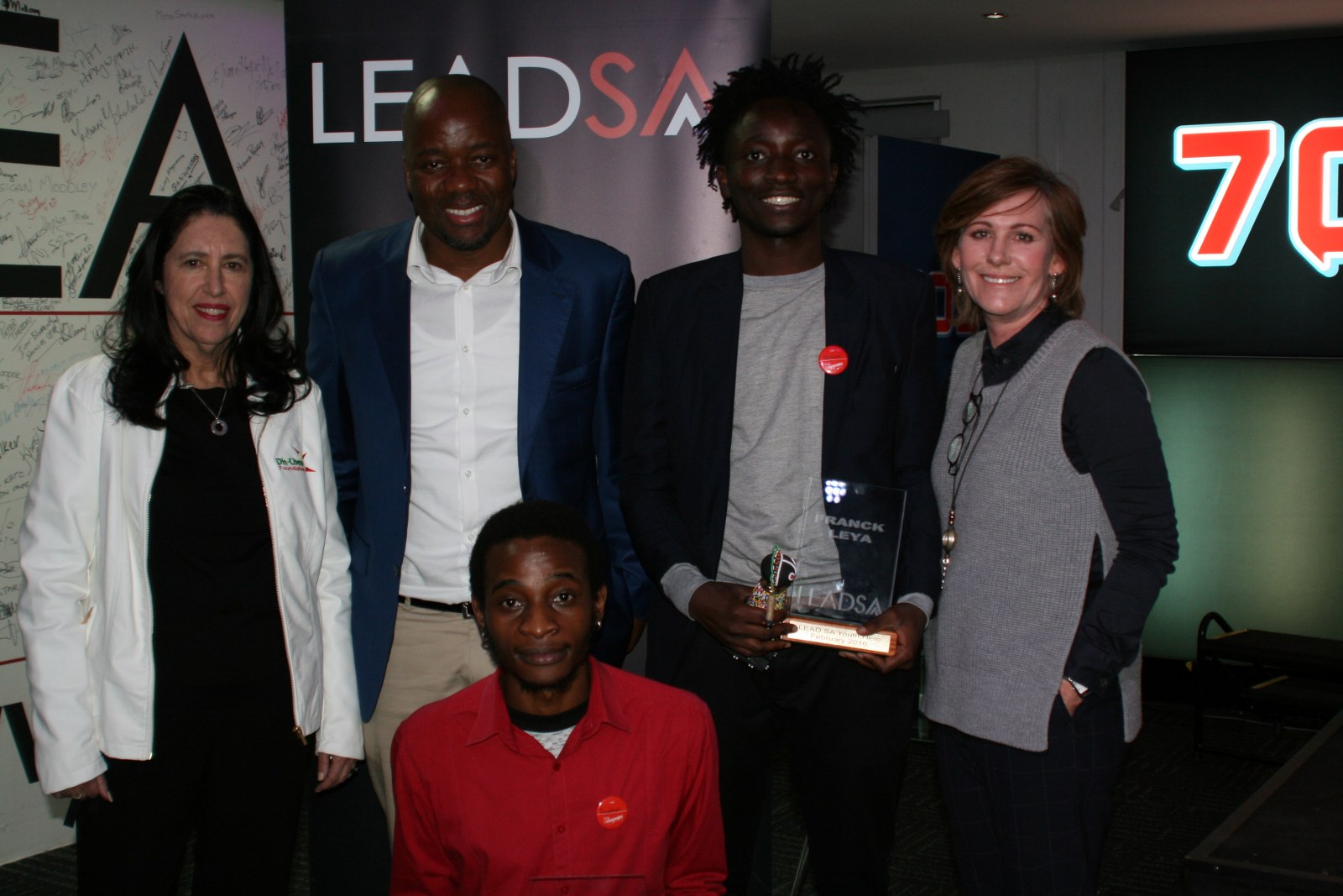 Lynette Saltzman Founder of the Dis-Chem Foundation, Xolani Gwala 702 Presenter, Franck Leya Lead SA Youth Hero 2016 , Terry Volkwyn CEO of Primedia Broadcasting and Founder of Lead SA and Jonathan Maliboho (in red) Lead SA Adult Hero 2016.