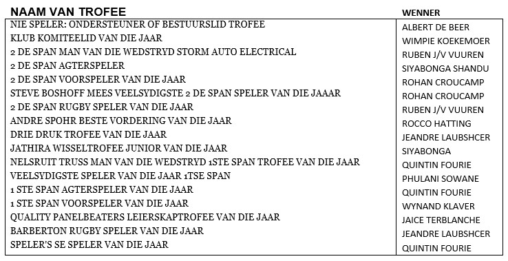 Barberton Rugbyklub het Vrydagaand hul jaarlikste afskeid en prysuitdeling gehou by Coronation Park.