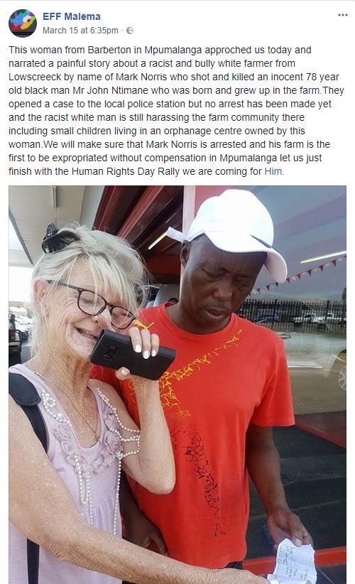 According to Christianson, the photo in the entry was taken on Thursday at a fuel station in town, while she was engaging in friendly conversation with a man in a red shirt, identified as Mpumalanga EFF leader, Collen Sedibe. Afterwards, the man requested that they pose for a photo together. Everyone who knows Christianson, who is the Marketing Director of Barberton Tourism, will know that she is the type of person who would not have questioned the motive for such a seemingly harmless request for a millisecond.