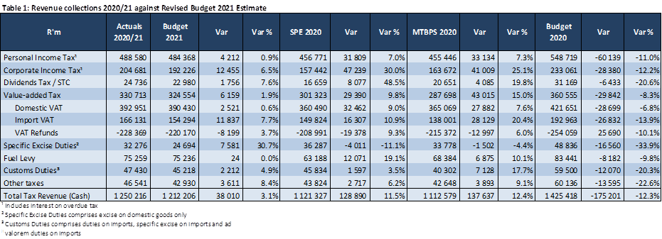 For the period ending 31 March 2021, SARS collected a gross amount of R1 541.1 billion which was offset by refunds of R290.9 billion, resulting in net collections of R 1 250.2 billion, versus Budget 2021 Revised Estimate of R1 212.2 billion, and which represented a contraction of –R105.6 billion ( -7.8%) against the 2019/20 financial year.