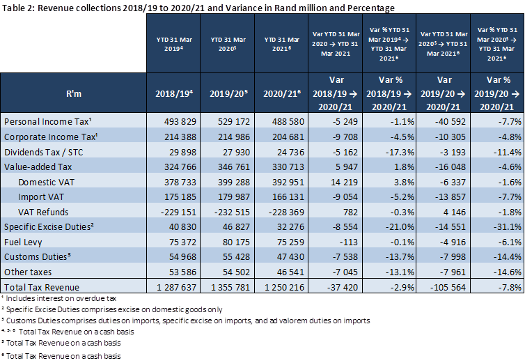 ·Customs Duties exceeded the RE by R2.2 billion (4.9%). However, collections were R8.0 billion (14.4%) less than prior year mainly due to declining growth rates from the largest commodity drivers of the tax; underpinned by the overall annual value of merchandise imports contracting by 12.6% for the period April 2020 to February 2021.
