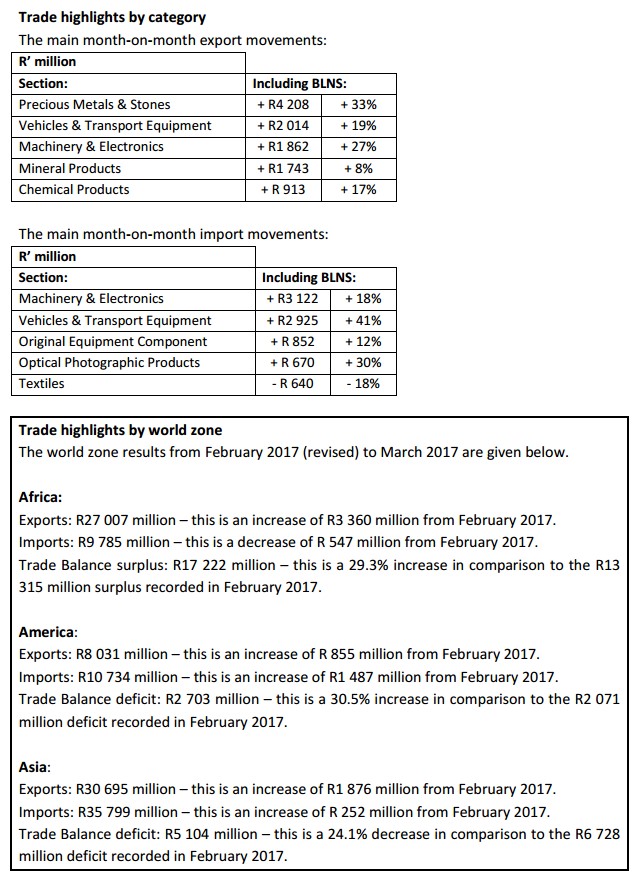Pretoria, 28 April 2017 – The South African Revenue Service (SARS) releases trade statistics for March 2017 recording a trade balance surplus of R11.44 billion. These statistics include trade data with Botswana, Lesotho, Namibia and Swaziland (BLNS). The year-to-date trade balance surplus (01 January to 31 March 2017) of R4.98 billion is an improvement on the deficit for the comparable period in 2016 of R24.27 billion.
