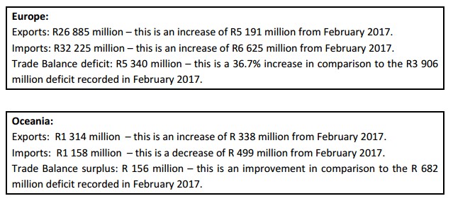 February 2017’s trade balance surplus was revised downwards by R0.43 billion from the previous month’s preliminary surplus of R5.22 billion to a revised surplus of R4.79 billion as a result of ongoing Vouchers of Correction (VOC’s).