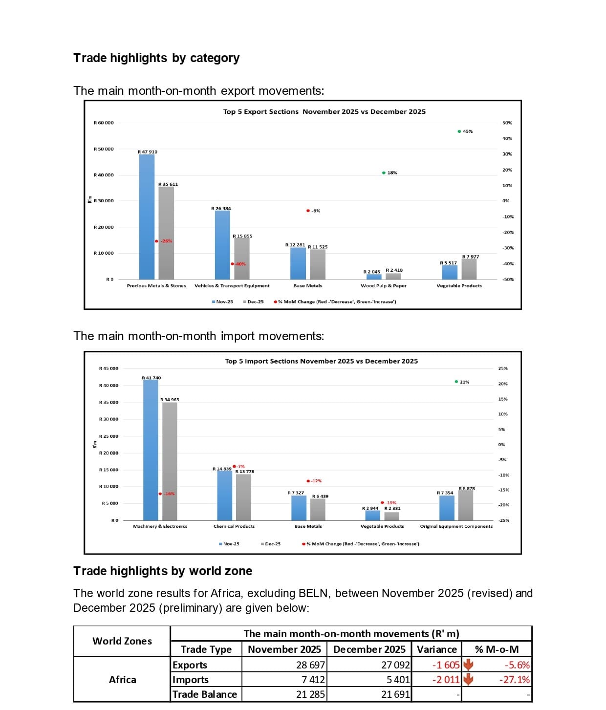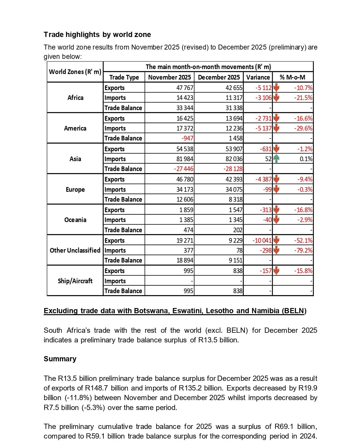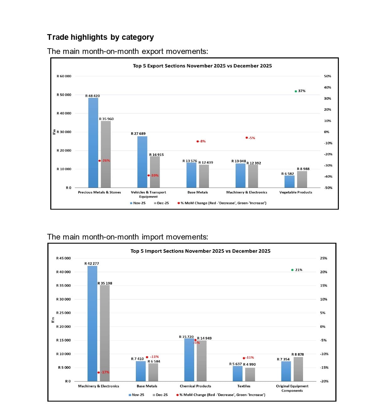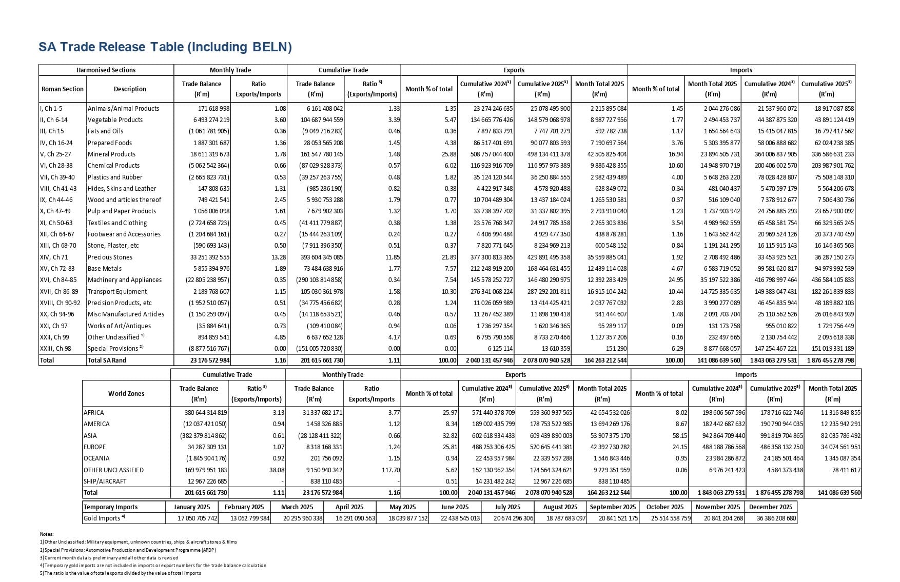 Due to ongoing Vouchers of Correction (VOCs), the preliminary trade balance surplus of R37.7 billion announced for November 2025 was revised upwards by R0.2 billion, with the final number at R37.9 billion.