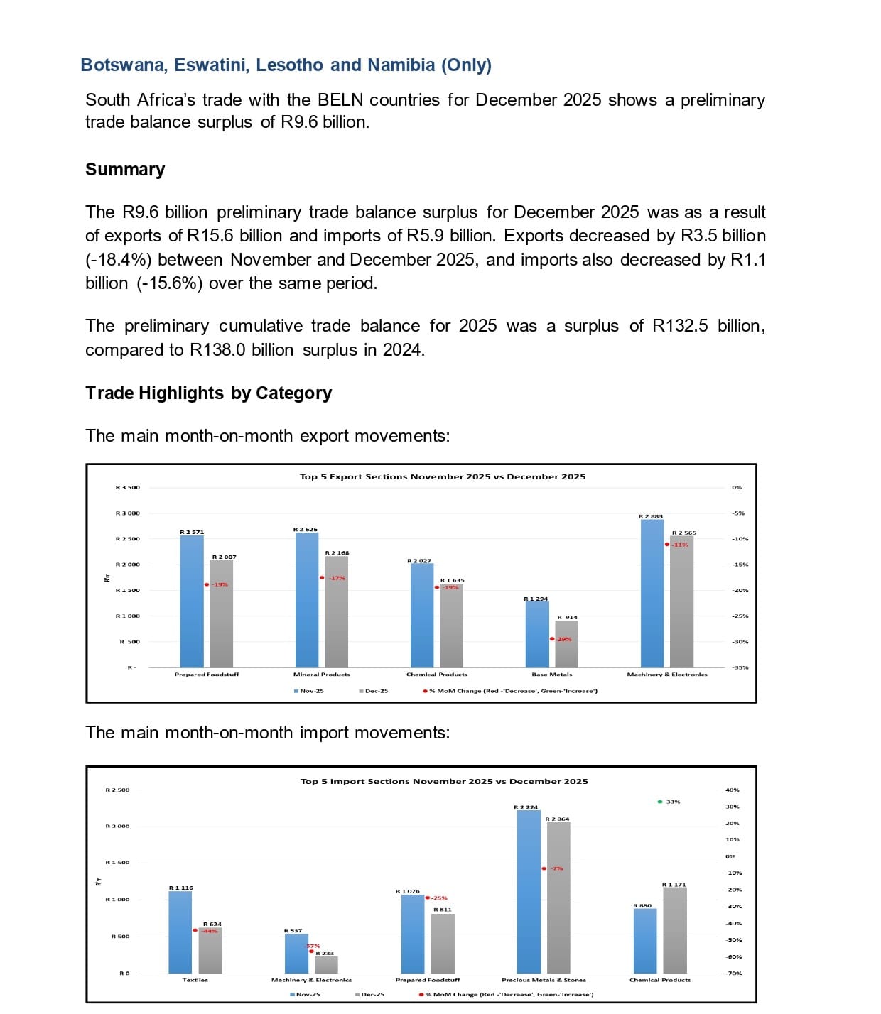 Pretoria, 30 January 2026 – South Africa recorded a preliminary trade balance surplus of R23.2 billion in December 2025. This surplus was attributable to exports of R164.3 billion and imports of R141.1 billion, inclusive of trade with Botswana, Eswatini, Lesotho and Namibia (BELN).