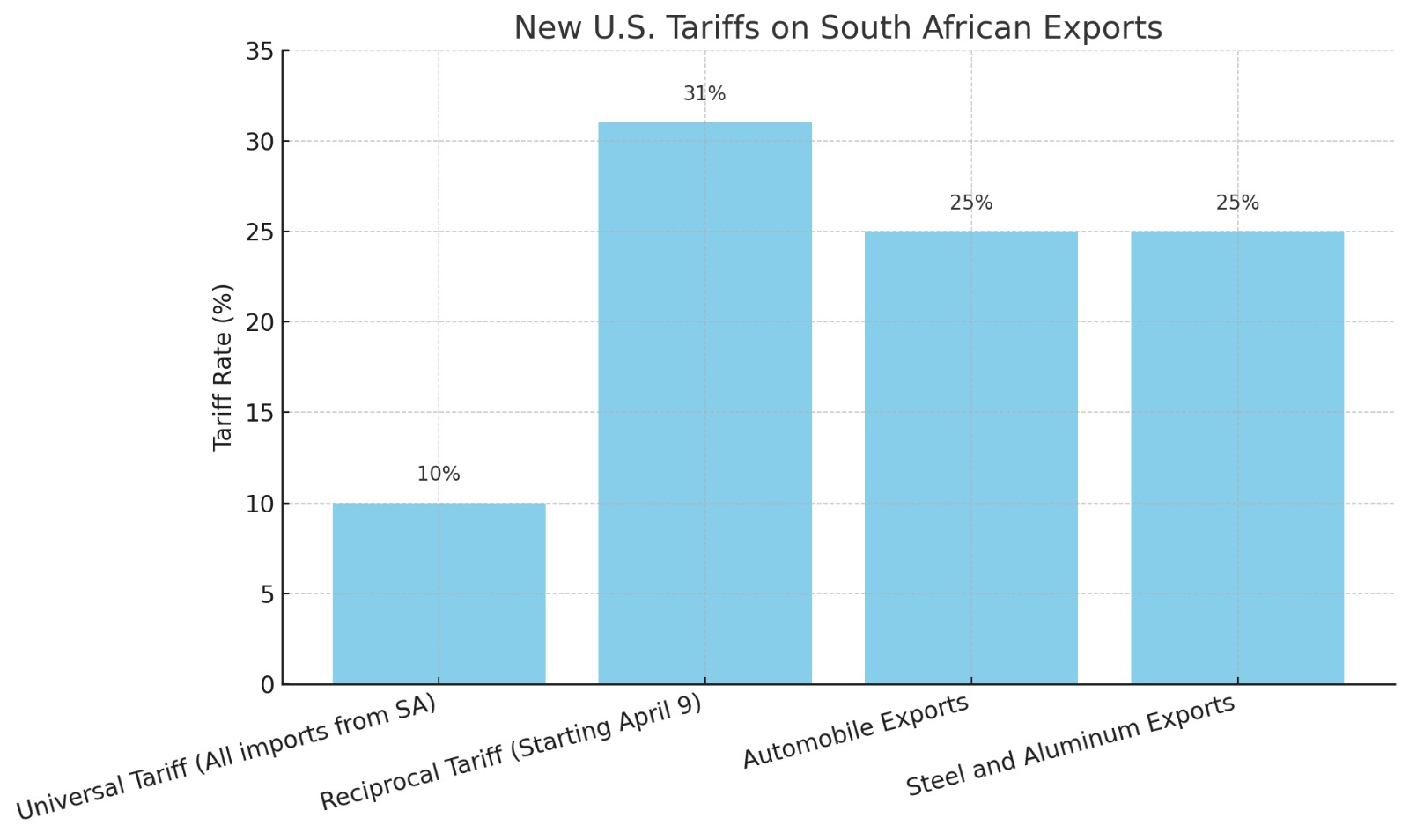 Starting April 5, a universal 10% tariff will apply to imports from all countries, including South Africa.