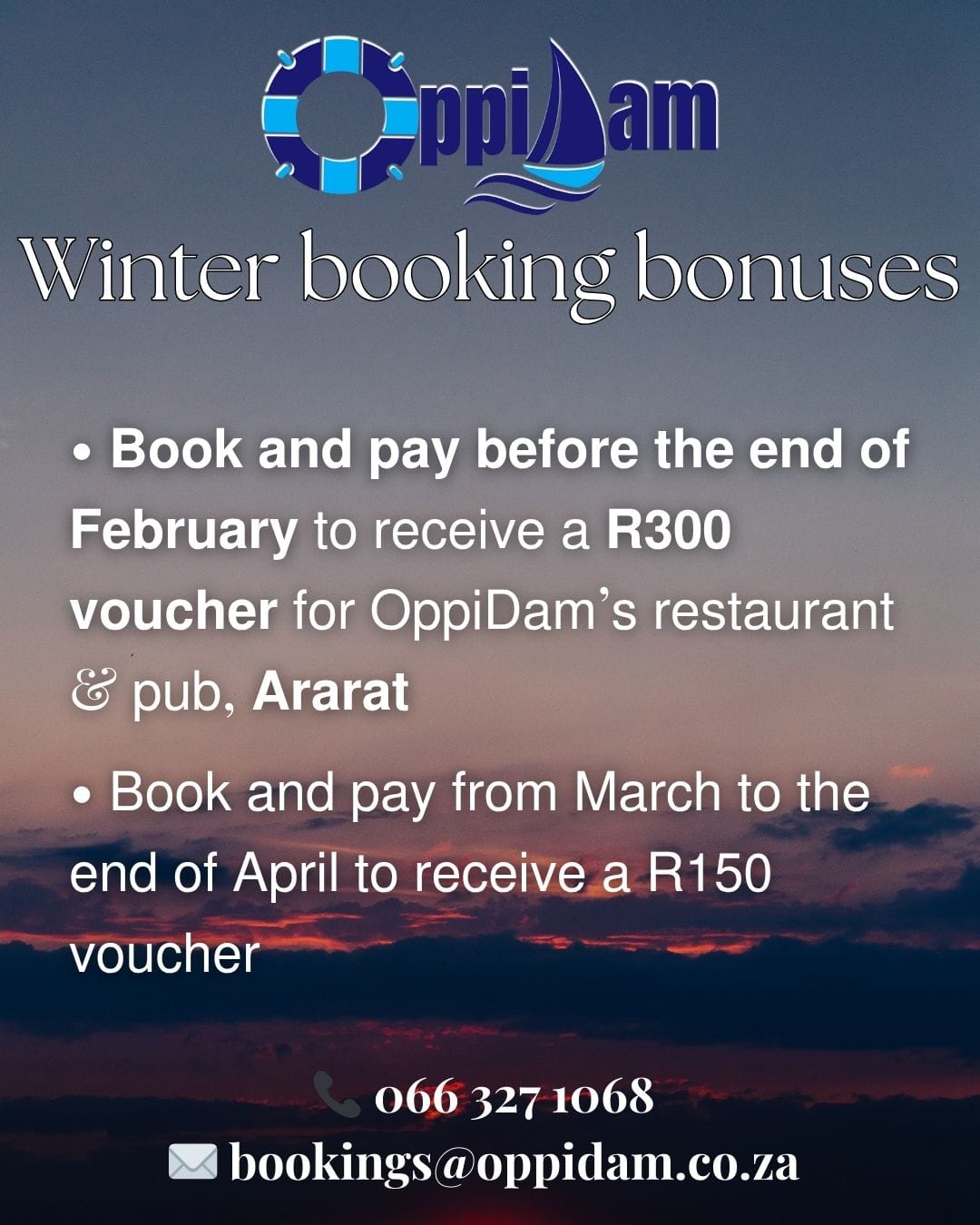 From May 15 to August 31, OppiDam runs its lowest rates of the year. For many families, couples and groups, this is the period when longer stays become affordable. Guests booking a minimum three-night stay also qualify for added value. Bookings paid before the end of February receive a R300 voucher for use at Ararat Restaurant and Pub. Bookings paid between March and the end of April receive a R150 Ararat voucher.